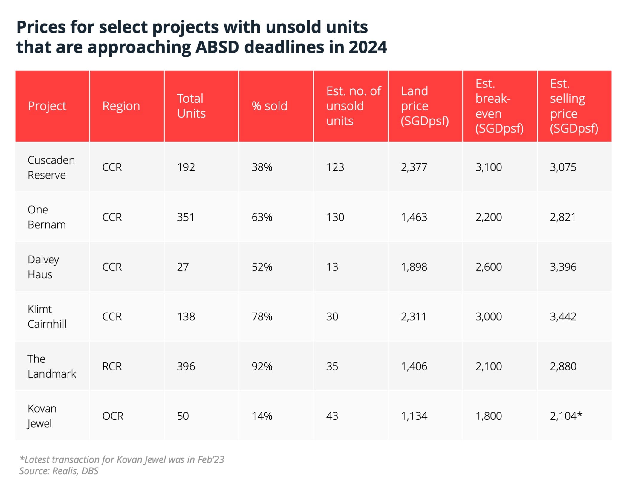 Amongst projects that have unsold units and are approaching ABSD deadlines in 2024, the DBS Group Research team did not see any clear trend of price cuts, although developers may offer more attractive commission rates to property agencies (i.e., upwards of 5%) to incentivise marketing their projects.