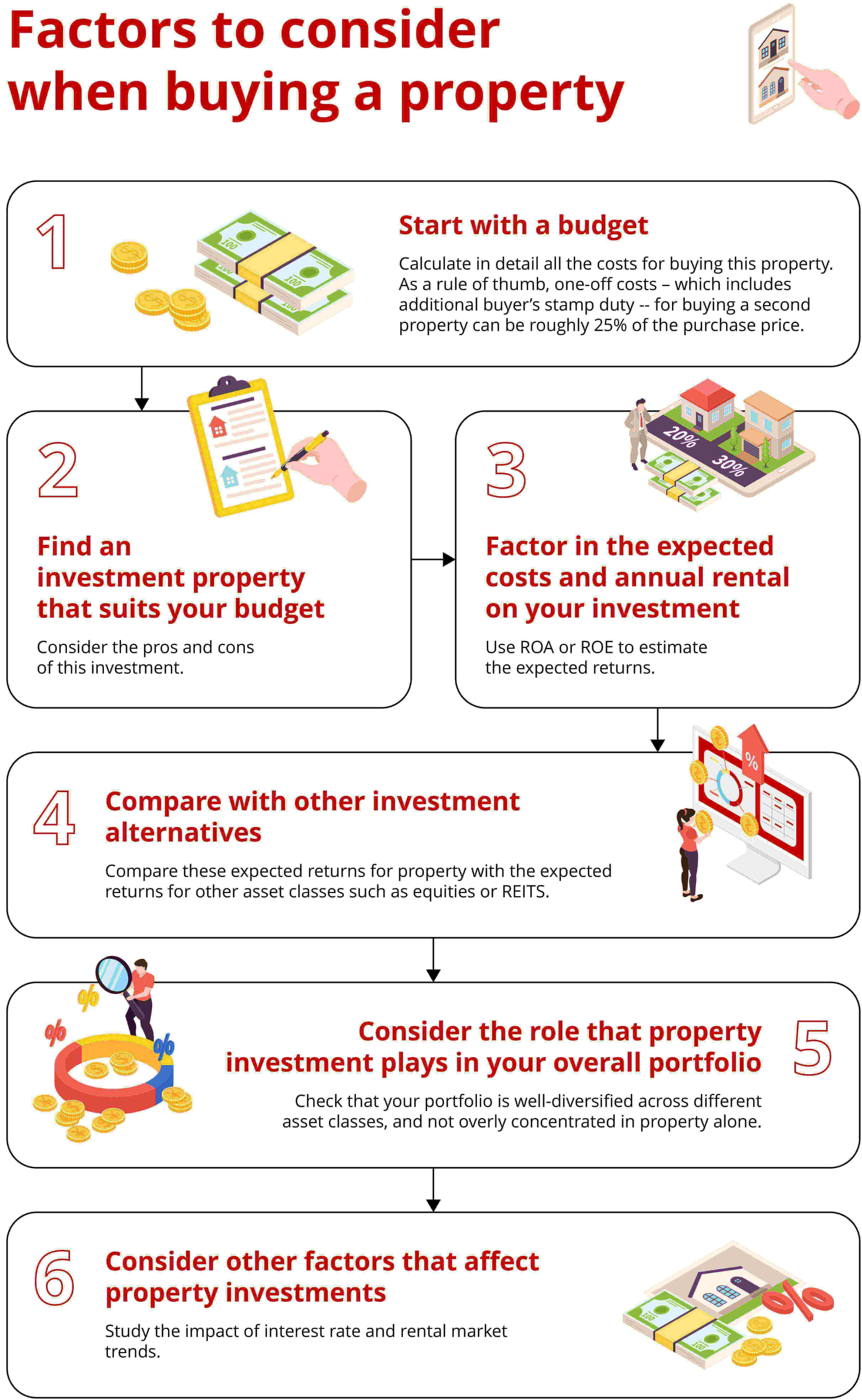 You can check out the DBS Home Marketplace to plan your budget for investing in a property and assess the monthly costs such as mortgage interest payments with tools like the DBS Repayment Calculator.