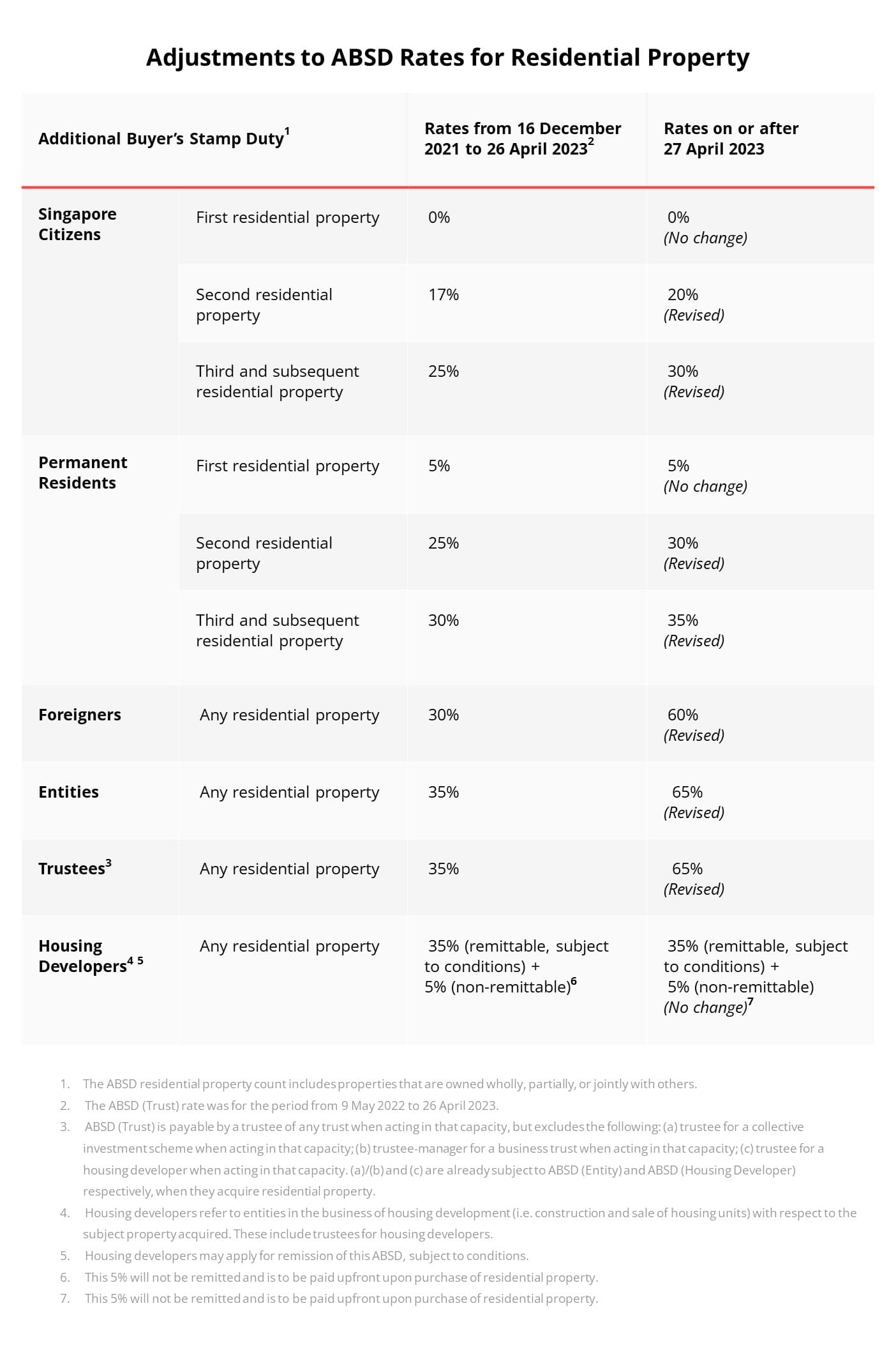 - The Buyer’s Stamp Duty (BSD) was increased since 15 Feb 2023, and the ABSD for residential property was increased on 27th April 2023.