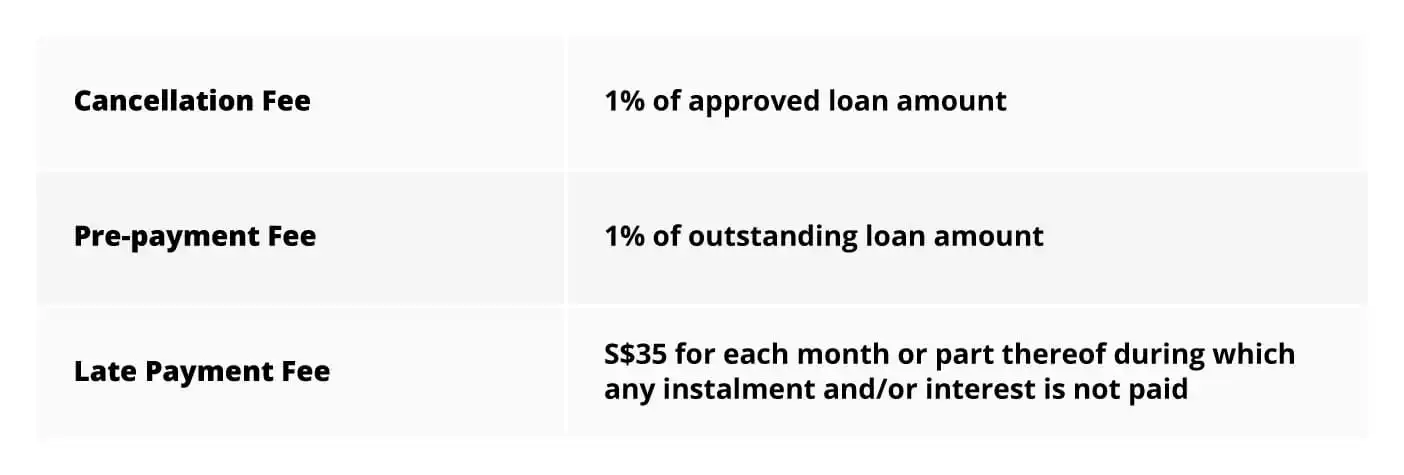 | Loan quantum | Single applicant: Up to 6x of monthly income or S$30,000, whichever lower Joint applicant: Up to 6 x 2 times the lower monthly income of the two applicants or S$30,000, whichever is lower |