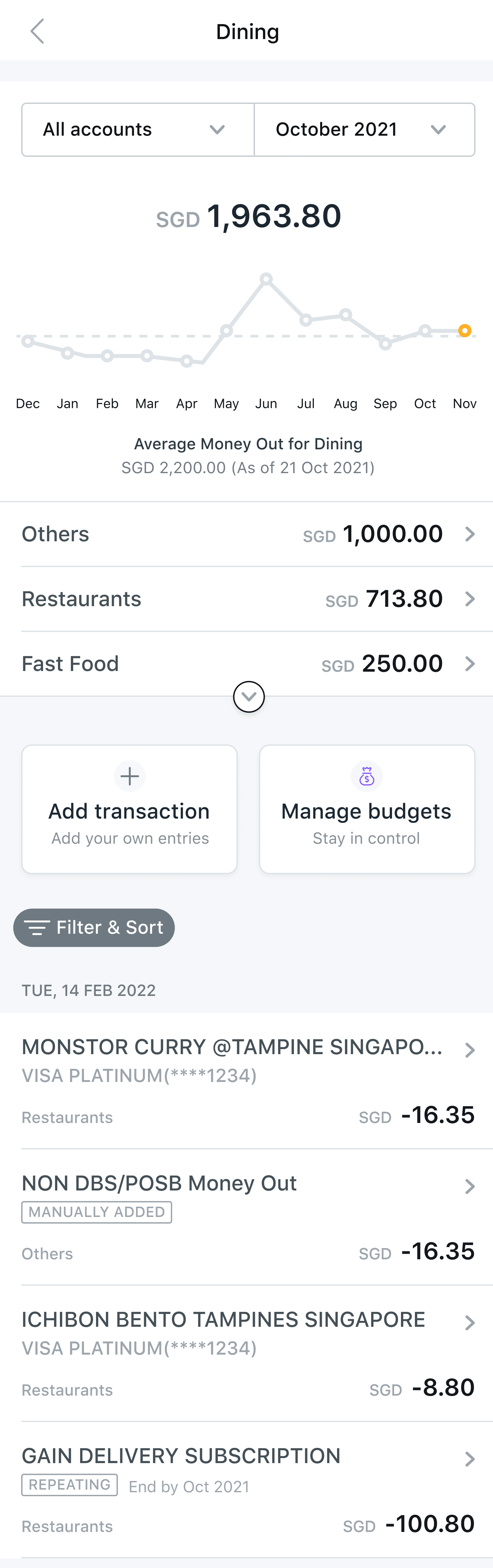 Scroll to the bottom and click on “Manage Budgets” to have better control over your expenses. Add your own transactions under specific categories that may not have been captured for more effective tracking. This way, you’d be able to monitor your progress and celebrate if you’re on track or have kept within your budget (small wins!).